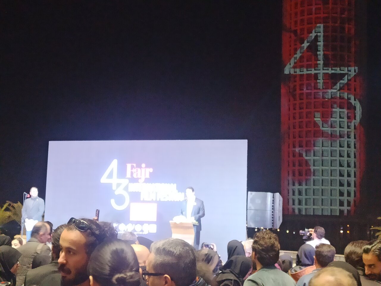 در مقابل جایگاه ساده اما پرشکوهی که در میانه محوطه برای سخنرانی برپا شده بود، شماری از هنرمندان برجسته کشور حضور یافتند؛ در پشت جایگاه سخنرانی نیز ساختمانی نیمهکاره با اسکلتهای فلزی و دیوارهای ناتمام خودنمایی میکرد اما همین سازه ناتمام، با نورپردازی خلاقانه به بخشی از مراسم بدل شد. لوگوی جشنواره جهانی فیلم فجر با پرتوهای رنگین بر دیوارهای آن نقش بست؛ گویی هنر، حتی بر سنگ و سیمان ناتمام نیز میتواند جان ببخشد. انعکاس نورها از نگاه تماشاگران، لحظهای شاعرانه و فراموشنشدنی خلق کرد.